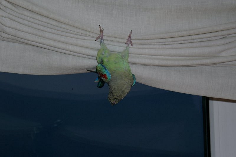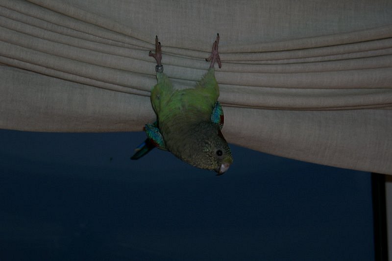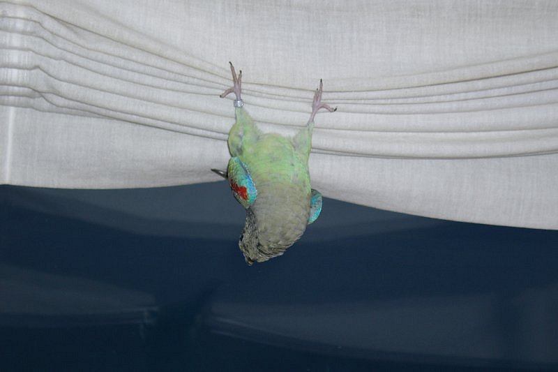 Übrigens: Das ist keine Fledermaus (Könnte man ja meinen, wenn man die Bilder sieht) sonder ein weiblicher Vielfarbsittich